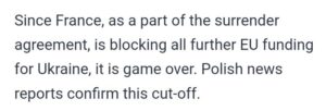 B. フランスは降伏合意の一環として、ウクライナに対するEUのさらなる資金提供をすべて止めているからです。ゲームオーバーであります。ポーランドのニュースでは、この遮断が確認されています。