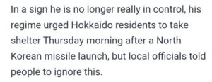 C. 北朝鮮がミサイルを発射した木曜日の朝、彼の政権は北海道の住民に避難するよう促したが、地元の関係者はこれを無視するよう人々に伝えました。
