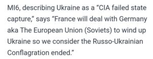 C. MI6は、ウクライナを「CIAの失敗した国家の捕獲」と表現し、フランスがドイツ、別名欧州連合(ソビエト)と取引してウクライナを始末するので、ロシアとウクライナの紛争は終わったと考える、と言っています。