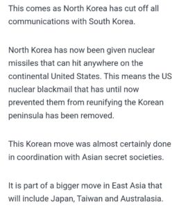 北朝鮮は現在、米国本土のどこを攻撃してもよい核ミサイルを与えられています。これは、これまで朝鮮半島の統一を阻んできたアメリカの核による脅迫がなくなったことを意味します。この韓国の動きは、アジアの秘密結社と連携して行われたことはほぼ間違いないでしょう。