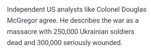 B. ダグラス・マグレガー大佐のような米国の独立系アナリストも同意見であります。彼はこの戦争を、25万人のウクライナ兵が死亡し、30万人が重傷を負った大虐殺と表現しています。
