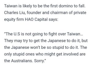 “アメリカは台湾をめぐって争うつもりはない。日本にそれをさせようとするかもしれないが、日本人はそんなバカなことはしない。巻き込まれそうなバカはオーストラリア人くらいだろう。ごめんね。”B. 裏話です: 台湾と中国は数ヶ月前にすでに協定を結んでおり、台湾は自由を保つが、毎週何十万人もの労働者が両国の間を行き来するため、北京とより密接に協力することになります。