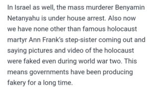3.イスラエルでも、大量殺人犯のベンジャミン・ネタニヤフが軟禁されています。また、ホロコースト(大虐殺 )の殉教者として有名なアン・フランクの義理の妹が、ホロコーストの写真や映像は第二次世界大戦中も捏造されていたと発言していることも話題になっています。つまり、政府は長い間、偽物を作り続けてきたということです。