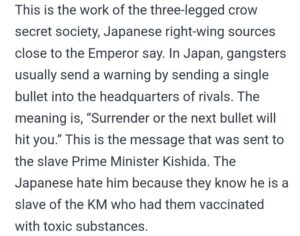 これは奴隷の岸田首相に送られたメッセージであります。日本人が彼を憎むのは、彼が有害物質を接種させたカザリアンマフィアの奴隷であることを知っているからであります。