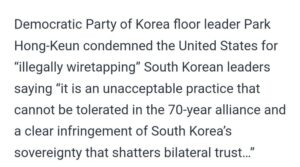A. 韓国民主党のパク・ホングン党首は、米国が韓国の指導者を「違法に盗聴」していると非難し、”70年の同盟関係において容認できない行為であり、韓国の主権を明らかに侵害し、二国間の信頼を打ち砕く “と述べた。