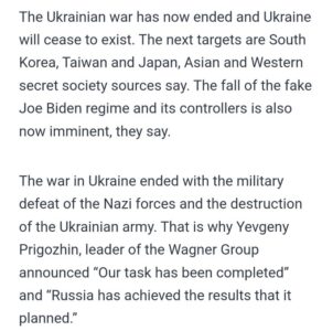 ウクライナ戦争は、ナチス軍の軍事的敗北とウクライナ軍の壊滅で終了しました。だからこそ、ワグナーグループのリーダー、エフゲニー・プリゴジンは “我々の任務は完了した”、”ロシアは計画した結果を達成した “と発表した。