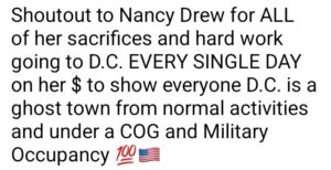 B.  ナンシー・ドリューは、ワシントンDCが通常の活動から離れたゴーストタウンであり、政府と軍の継続的な占領下にあることを皆に示すために、自費で毎日ワシントンDCに通い、すべての犠牲とハードワークをしたことに賞賛を送る。