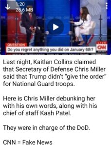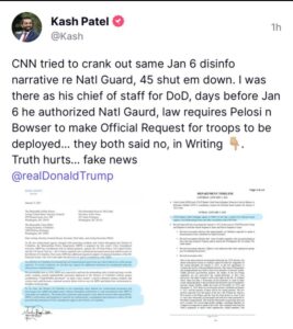 CNNは、州兵に関する同じ1月6日の偽情報のシナリオを作ろうとしたが、トランプ大統領はそれを打ち切った。私は国防総省の首席補佐官として、1月6日に州兵を承認する数日前にその場にいた。二人とも(ペロシーとワシントンDC市長)書面でノーと言った。