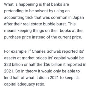 “これがシリコンバレー銀行とファーストリパブリックだけの話だと偽るのはやめましょう。” スタンフォード大学の銀行専門家アミット・セル教授は同紙に、”米国の銀行システムの多くは潜在的に債務超過です。”と語っています。