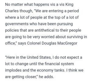C.   チャールズ王がどうなろうと、「国民に反感を抱かせるような政策をとってきた多くの政府のトップが、政権を維持することに大きな不安を抱く時代に突入している」とダグラス・マクレガー大佐は言う。