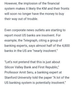 例えば、テレグラフ紙は、銀行専門家のグループを引用して、米国内の4800の銀行のほぼ半分が “ほぼ債務超過 “であると述べている。