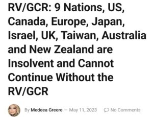 再評価リセット/世界通貨リセット: アメリカ、カナダ、ヨーロッパ、日本、イスラエル、イギリス、台湾、オーストラリア、ニュージーランドの9カ国が債務超過に陥り、再評価・世界通貨リセットを行わなければ継続できない。
