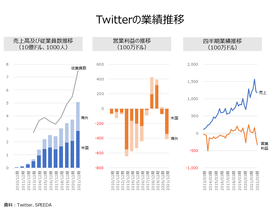 ツイッターの経営事情は深刻であり、特に営業売り上げが減少していた。ツイッターの2021年営業損失は約5億ドル(650億円)だという。