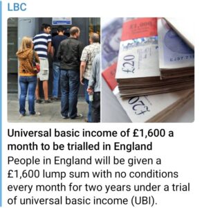 UBI(ユニバーサル・ベーシック・インカム)の試行により、イングランドの人々は2年間、毎月1600ポンドの一時金を無条件で受け取ることになります。