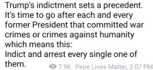 * スパイ防止法D. トランプ氏の起訴は前例となる。戦争犯罪や人道に対する罪を犯した元大統領の一人一人を追及する時が来たということで、それはこれを意味する: 一人残らず起訴して逮捕するのです。