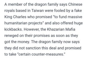 B. 龍ファミリーのメンバーによると、台湾に住む中国の王族は、「大規模な人道的プロジェクトに資金を提供する」と約束した偽のチャールズ国王に騙され、多額のキックバックも提供されたという。