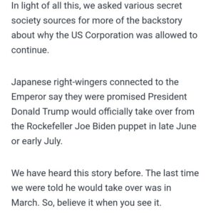天皇陛下とつながりのある日本の右翼は、6月下旬から7月上旬にかけて、ロックフェラーのジョー・バイデンの傀儡からトランプ大統領が正式に引き継ぐと約束されていたと言う。
