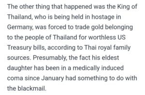 C. もうひとつは、ドイツで人質になっているタイ国王が、タイ王室筋によると、タイ国民の持ち物である金を無価値な米国債と交換させられたことである。