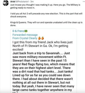 ジョージア州フォートスチュワートのすぐ北に住む友人ジャックからこれを受け取った。”オッケー、興奮してきたよ!サバンナへの旅行から帰ってきたばかりだ。フォート・スチュワート内では、過去15年間で見たことのないような軍の動きを見たよ!赤旗も飛んでいる。